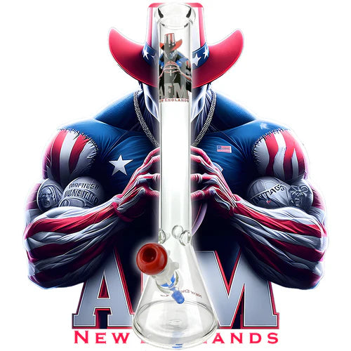 Standing 18 inches tall, this limited edition 5mm borosilicate glass beaker bong comes decorated with a gridiron-inspired New England football deca...