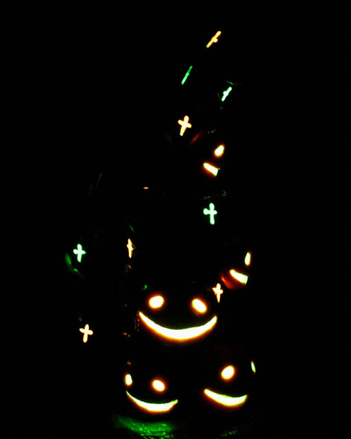 Jack-O’-Lantern Stack Pumpkin Beaker Bong, a hand-sculpted glass masterpiece that fuses Halloween and Dia de los Muertos artistry. Standing 8 inche...